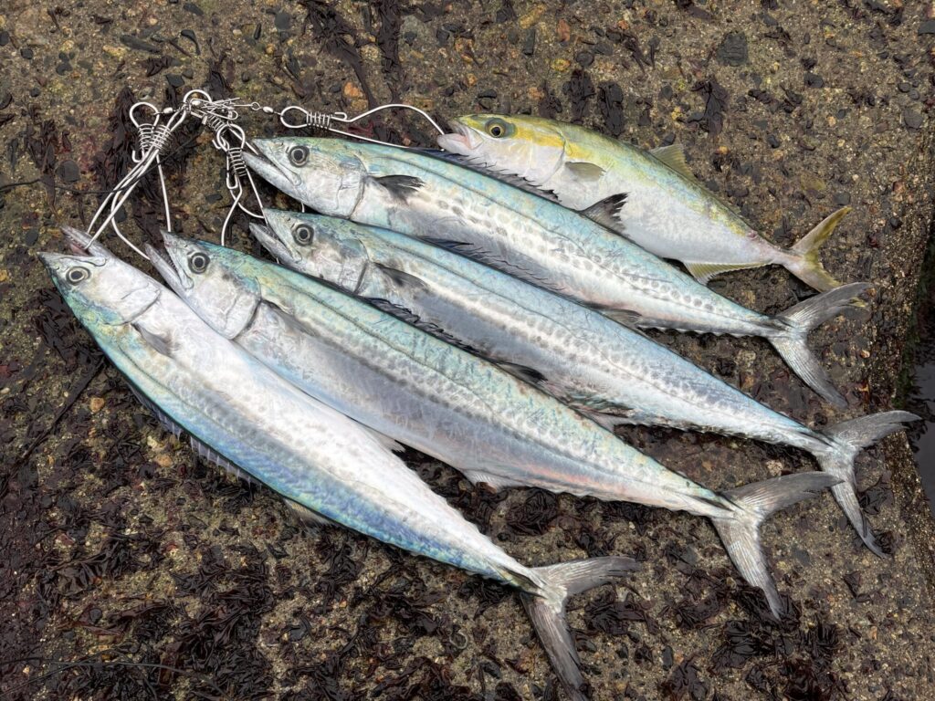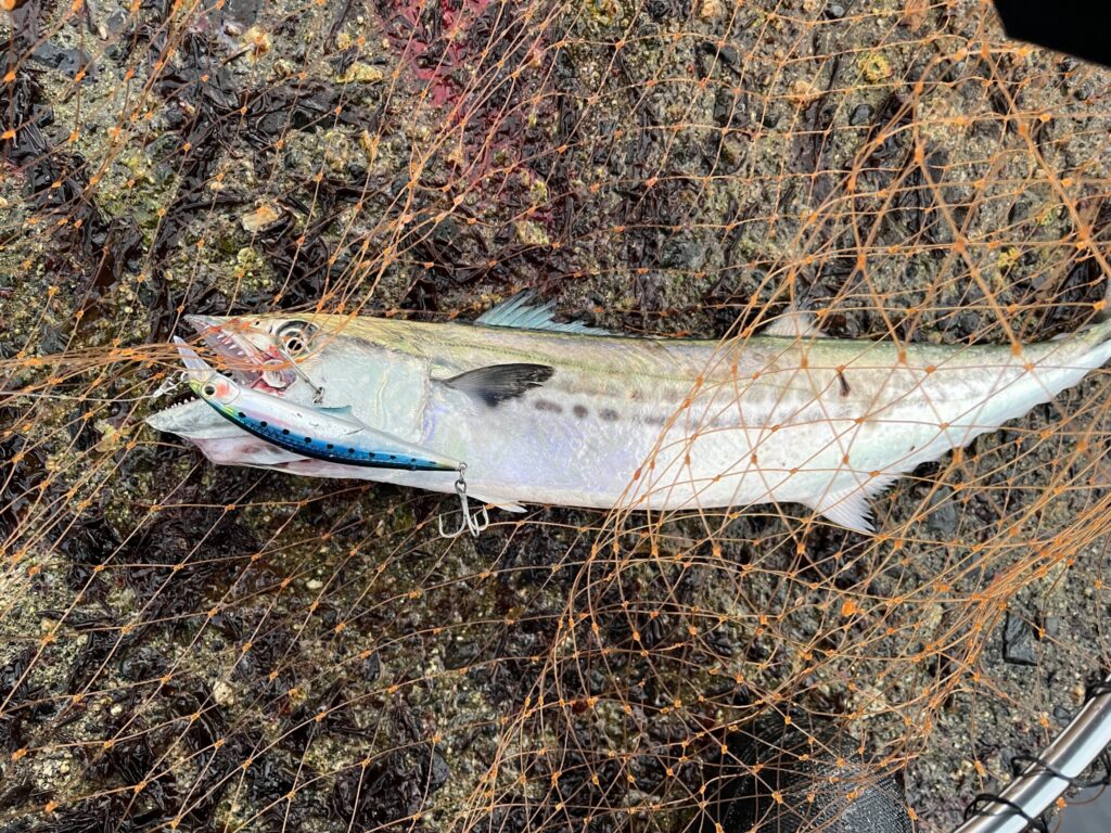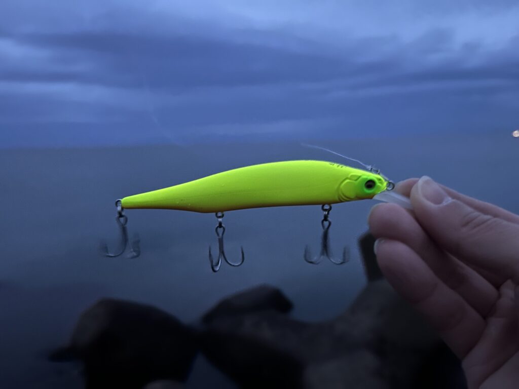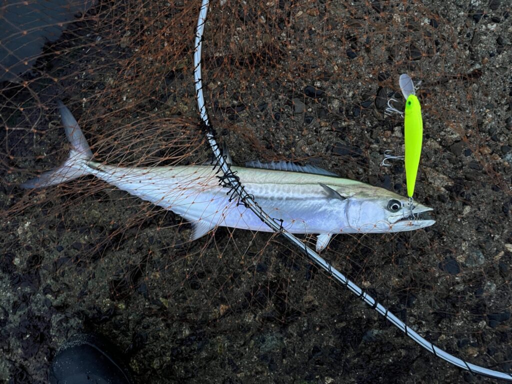 隣の人は、最初はジグ投げてたけど反応薄かったのでミノーに変えたら釣れ始めたそうです。ただ、サゴシよりサバが多かったとのこと。ミノーの種類によってレンジが変わるので、釣れる魚も違ってくるのかもしれませんね。