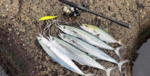 とりあえず投げます。見えてるのはほぼサバでも、シーバスや青物が紛れていることもよくあります。