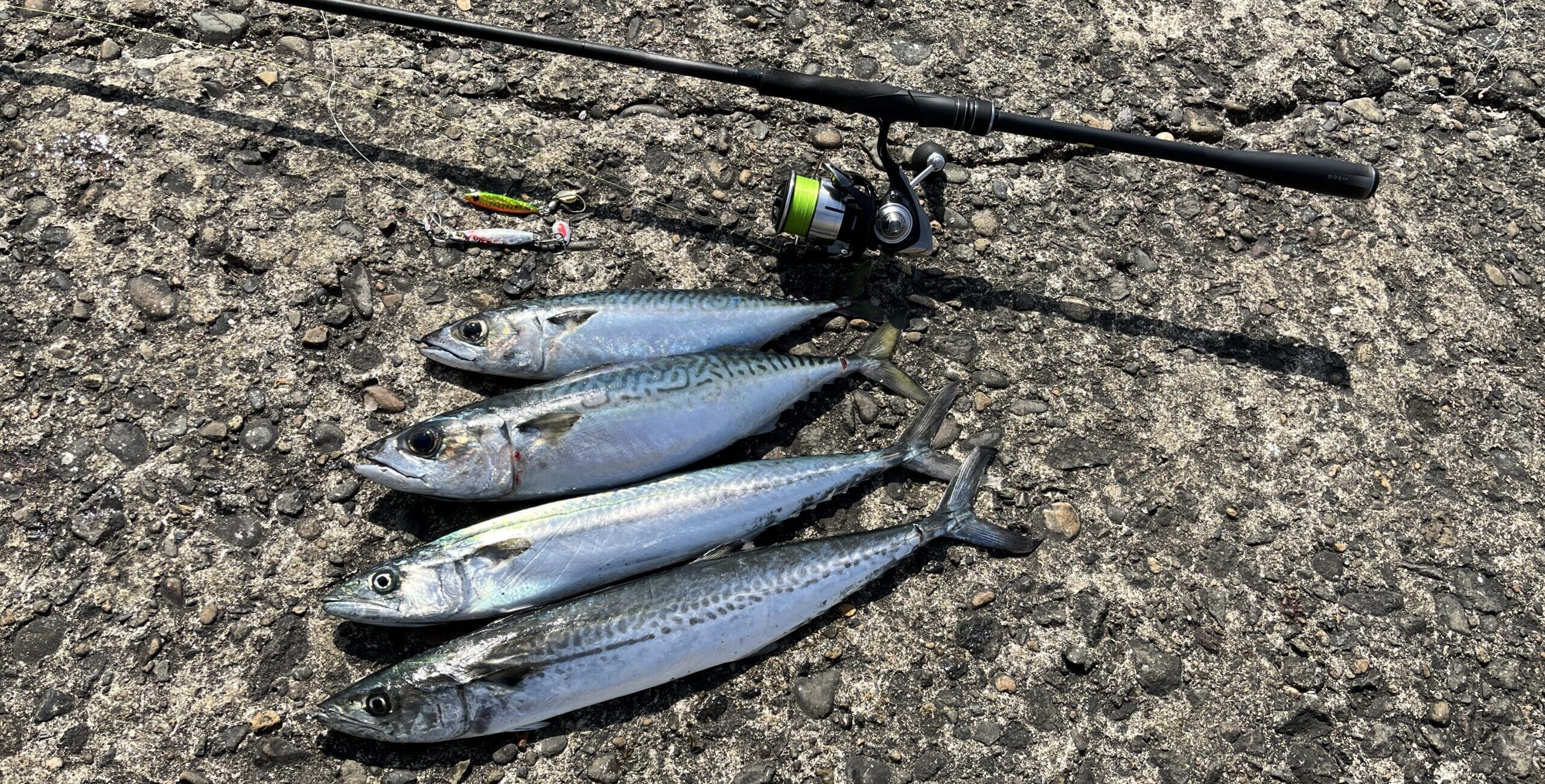 そして、稚鮎を追ってサバのナブラが立ち始めます。先ほどまで鏡のようだった海が急に活気付き始めます。釣り人の活性もMAX!!みんなでここぞとばかりに投げます。